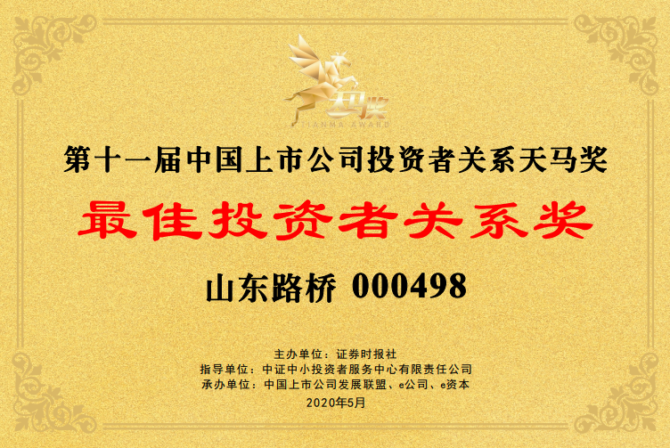 5月13日,由證券時(shí)報(bào)主辦,中證中小投資者服務(wù)中心有限責(zé)任公司擔(dān)任指導(dǎo)單位的“第十一屆中國上市公司投資者關(guān)系天馬獎(jiǎng)”榜單發(fā)布。山東路橋獲評“最佳投資者關(guān)系獎(jiǎng)”“最佳董事會(huì)獎(jiǎng)”。