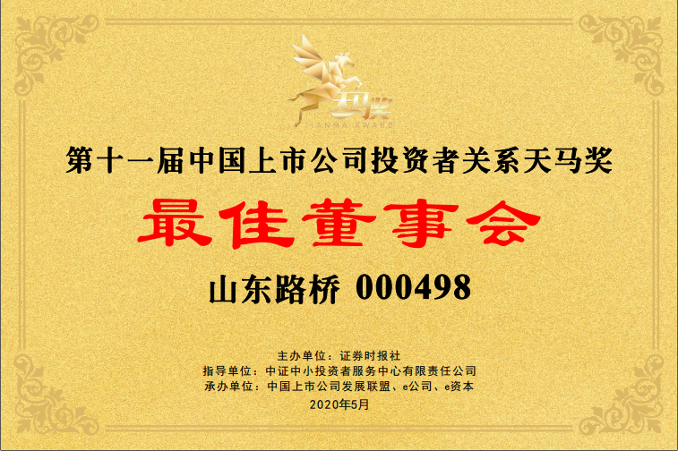 據(jù)悉,本屆“天馬獎(jiǎng)”是新《證券法》實(shí)施后的首次評選,產(chǎn)生最佳投資者關(guān)系公司獎(jiǎng)、最佳投資者關(guān)系董事會(huì)獎(jiǎng)、最佳投資者關(guān)系董秘獎(jiǎng)、最佳新媒體運(yùn)營獎(jiǎng)等四大獎(jiǎng)項(xiàng)。在上千家參評單位中,山東路橋經(jīng)過合規(guī)和資格篩查、公司申報(bào)、機(jī)構(gòu)推薦、網(wǎng)絡(luò)投票、評委評審與交易所審核等六大環(huán)節(jié)層層遴選,最終脫穎而出,成功獲評“最佳投資者關(guān)系獎(jiǎng)”“最佳董事會(huì)獎(jiǎng)”。此次獲評是對山東路橋在投資者關(guān)系、價(jià)值創(chuàng)造、成就取得和社會(huì)貢獻(xiàn)等方面的充分肯定,下一步,山東路橋?qū)⒗^續(xù)創(chuàng)造佳績,提升投資者關(guān)系工作質(zhì)量,回饋股東與社會(huì),助推我國資本市場穩(wěn)定健康發(fā)展。